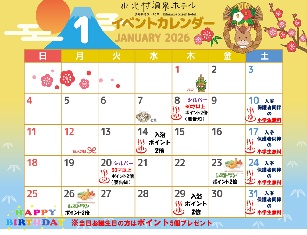 毎月恒例のシルバーデイ(60歳以上のお客様・要告知)入浴ポイント2倍等をご用意いたしました。