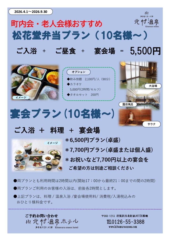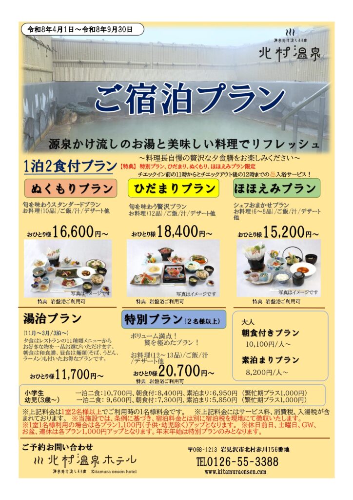令和8年(2026年)4月1日より料金が改定されます 2026年2月10日 最終更新日時 : 2026年2月13日 スタッフ北村 いつも北村温泉ホテルをご利用いただき、誠にありがとうございます。 この度、令和8年(2026年)4月1日(水)より日帰り入浴・宿泊・宴会の料金を改定させていただきます。 詳しくは下記をご覧ください。