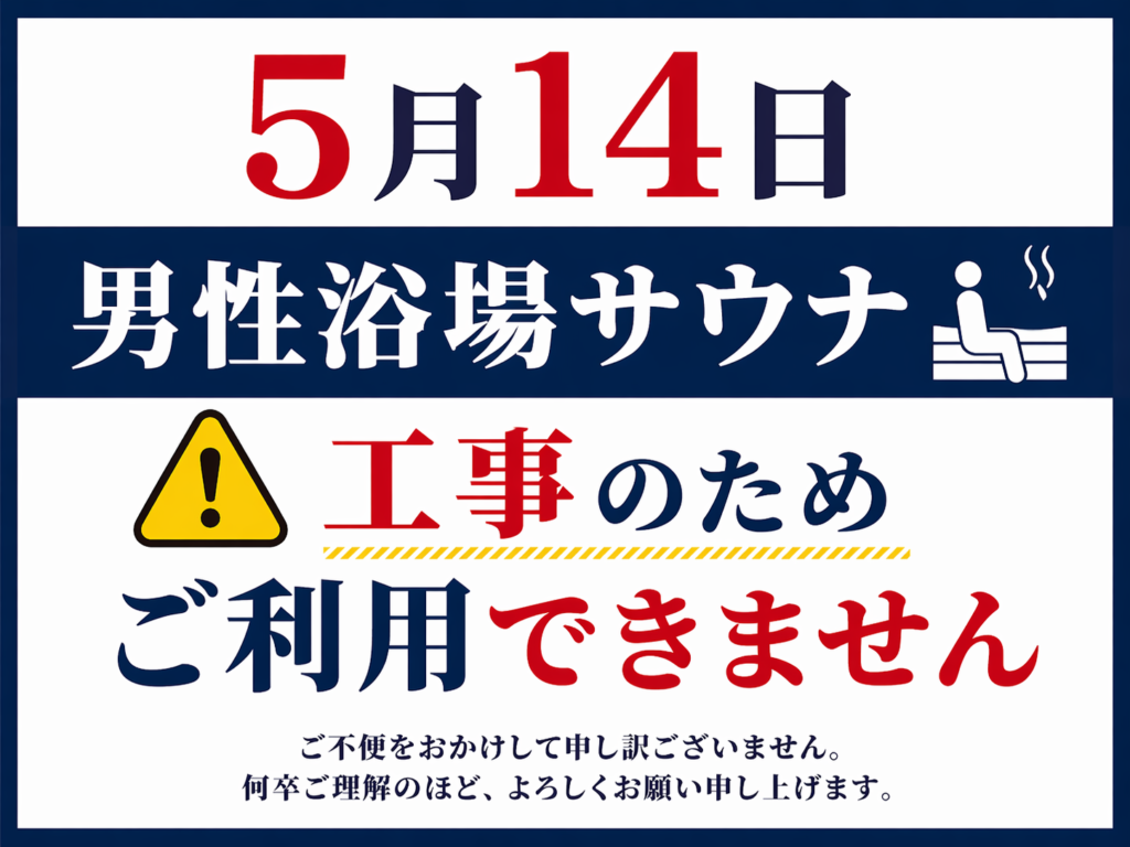 5月14日木曜日に工事のため、男性浴場サウナが終日利用休止とさせていただきます。